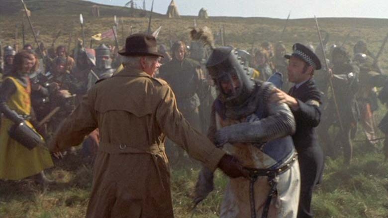 In Monty Python, of course, the medieval literally intrudes into modernity when a mounted knight attacks and kills a “Famous Historian,” which leads to (spoiler alert, I guess) modern police arresting Arthur and Bedivere to end the film.